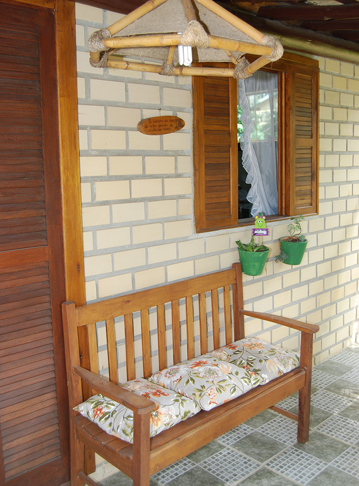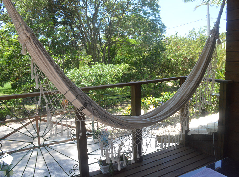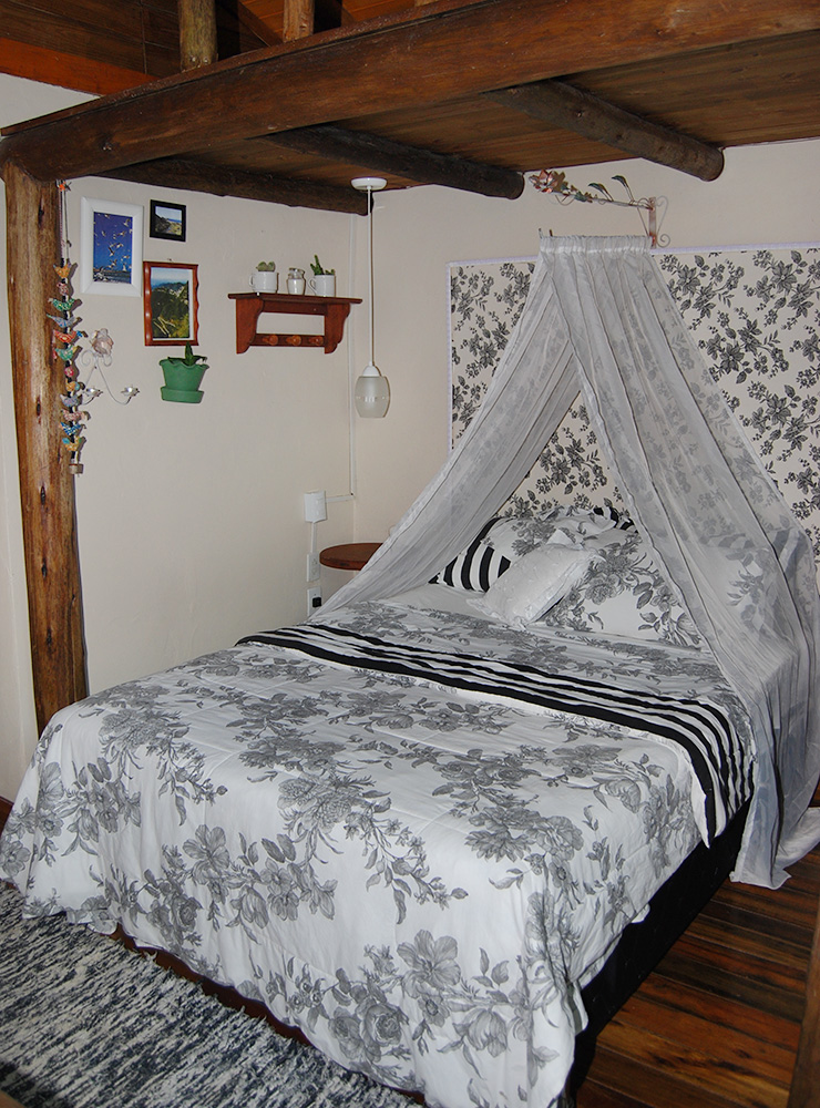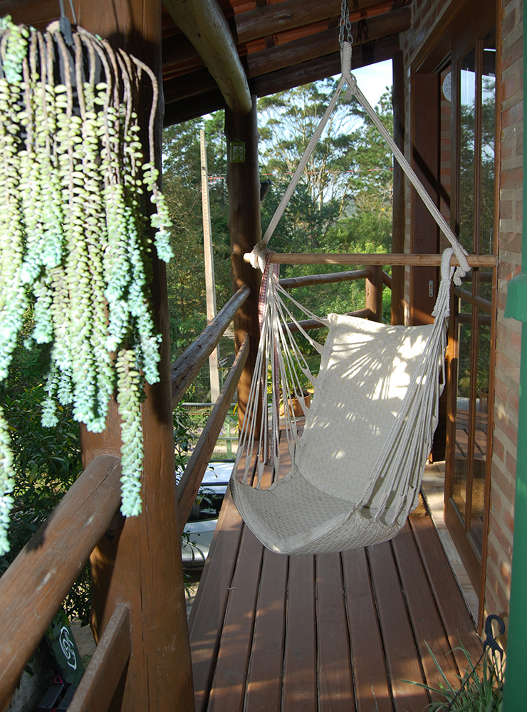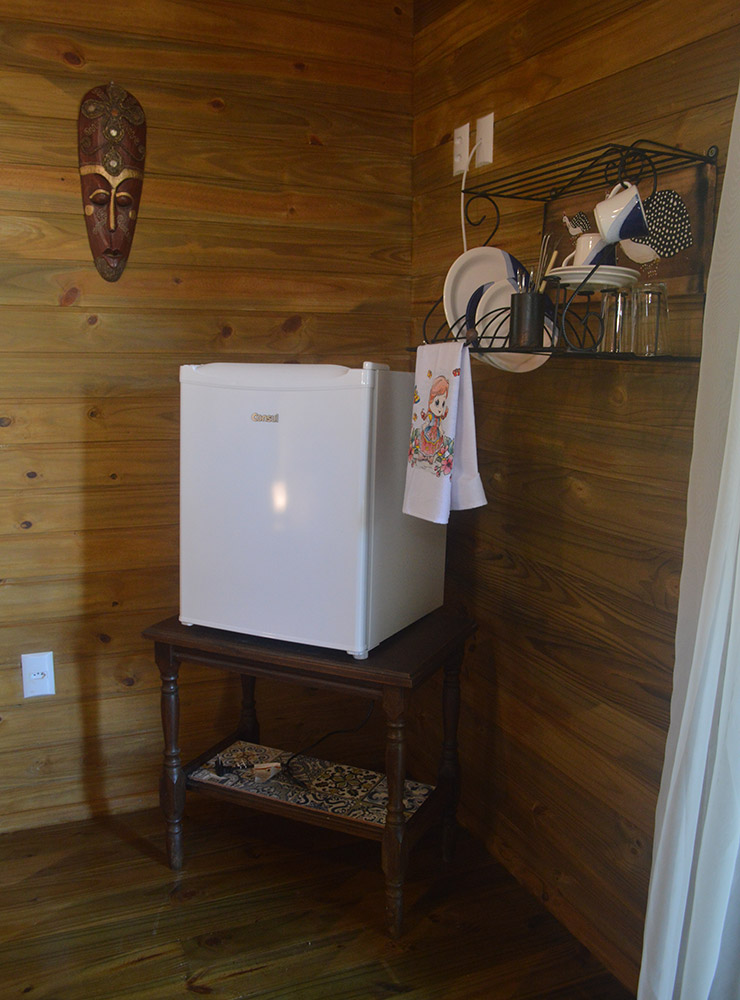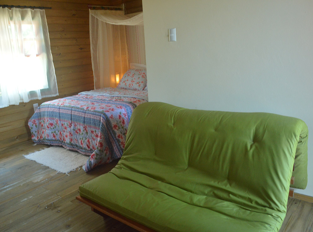 A Suíte Coruja (1º andar / até 4 pessoas) possui ar condicionado split, frigobar, microondas, TV Led de 32'', cama box casal, travesseiros, roupa de cama percal 100% algodão, toalhas, sofá-cama casal tipo futon, ideal para acomodação de um terceiro e quarto hóspede, chuveiro a gás e uma ampla varanda com rede.